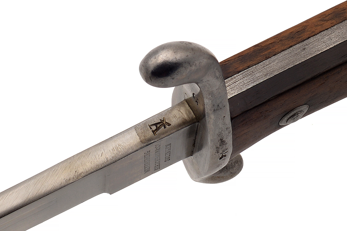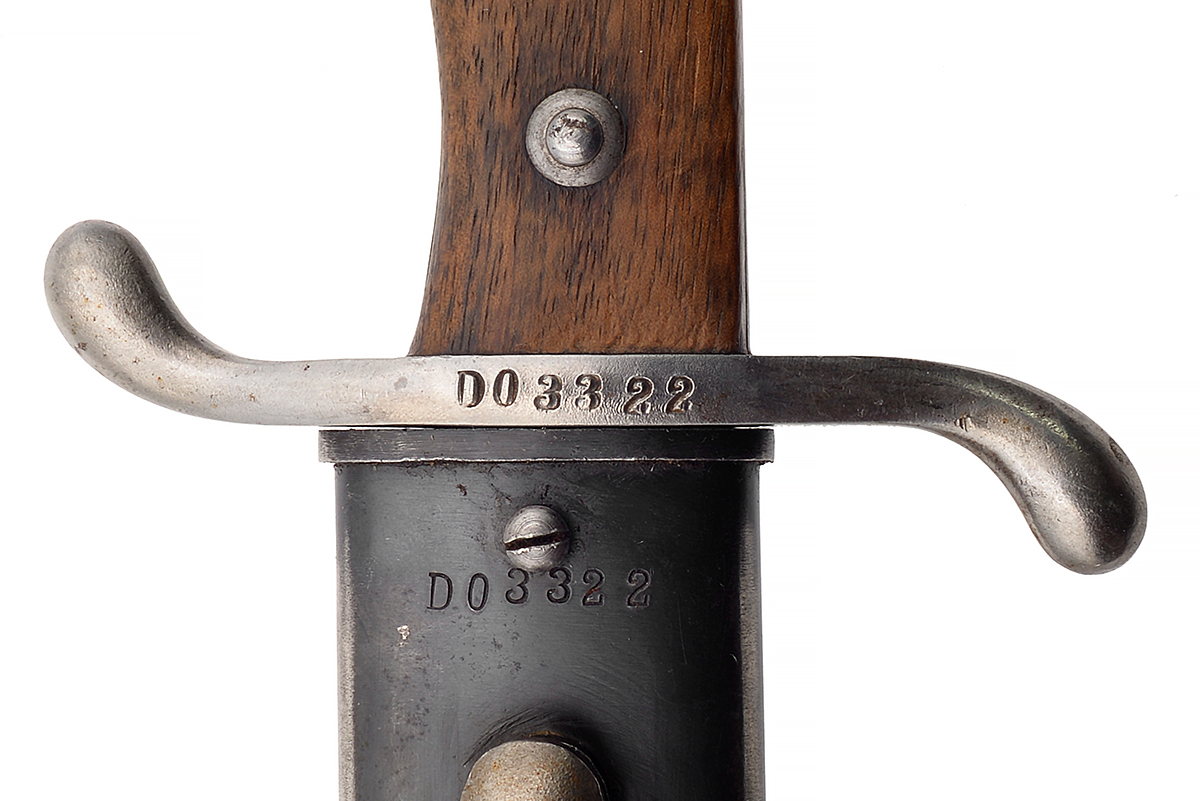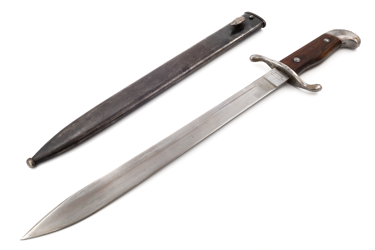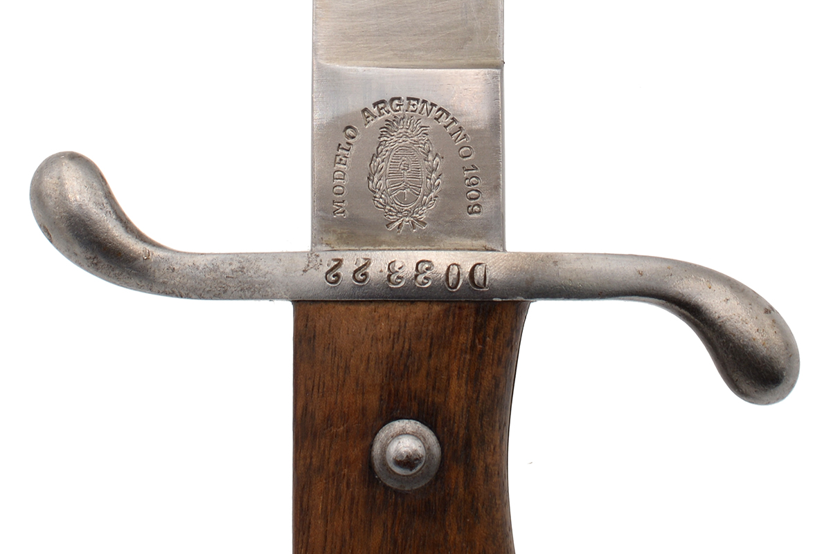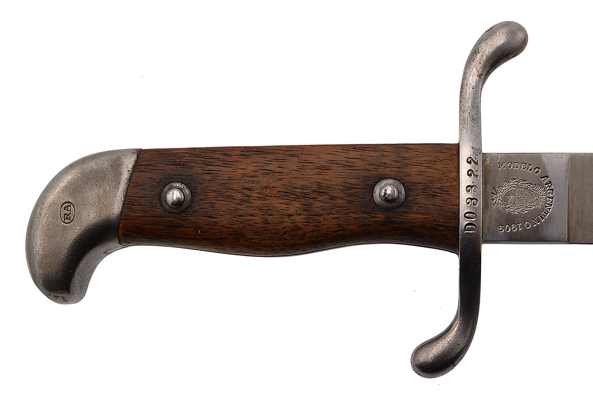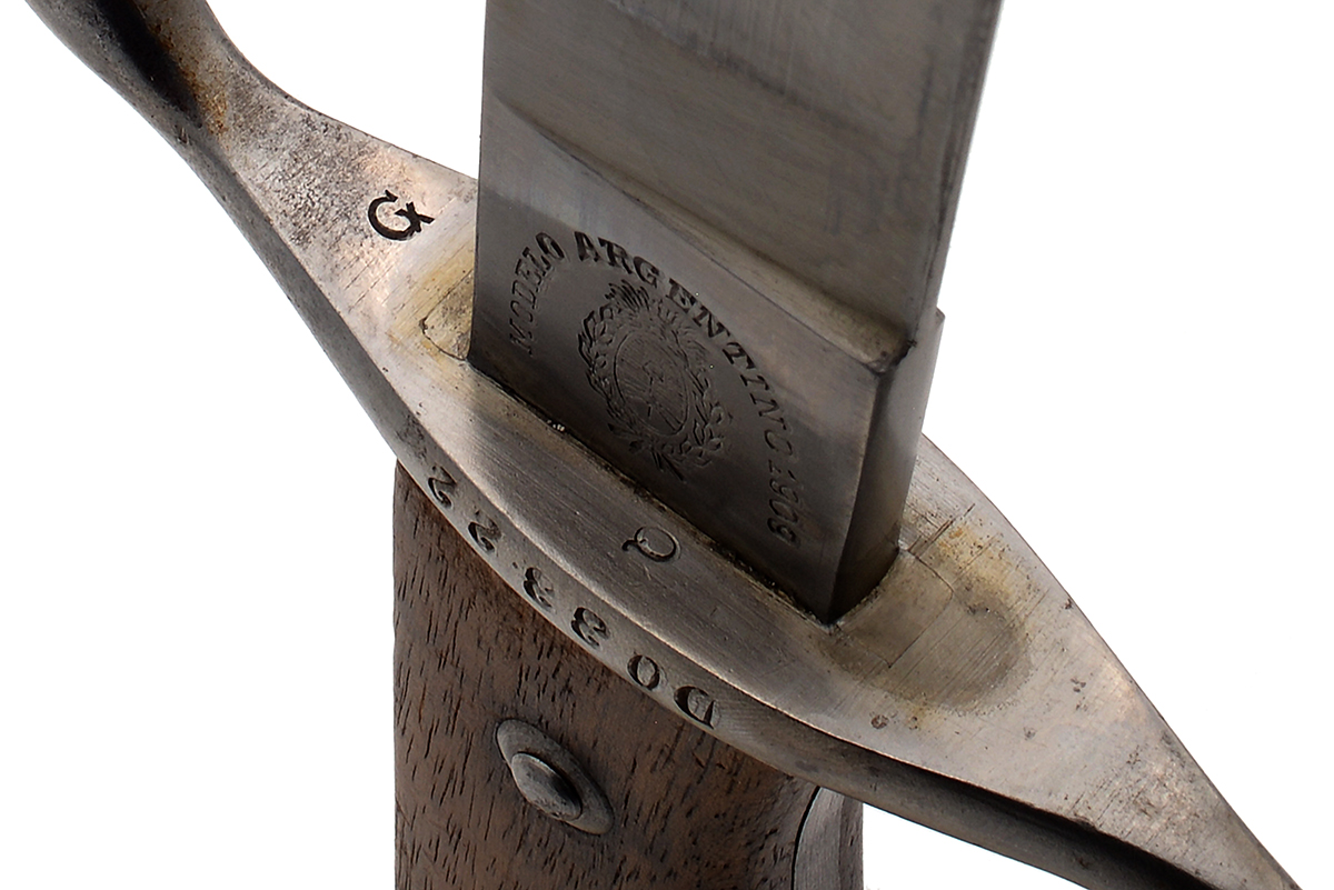 This is an Argentine M1909 Artillery Short Sword. It features a 14.75" "Butcher" style blade and total length of 20.5", the ricasso marked "MODELO ARGENTINO 1 H8669" (only part of the "1909" on one side and on the other side is marked "WEYERSBERG, KIRSCHBAUM & CO, SOLINGEN". The right side of the pommel is marked "RA" for República Argentina and the scabbard has a matching number to the bayonet. Overall condition is good with the original edge, there are some scratches to the blade along with a few spots of tarnishing, the scabbard has some light wear to the bluing. Buy online today!
