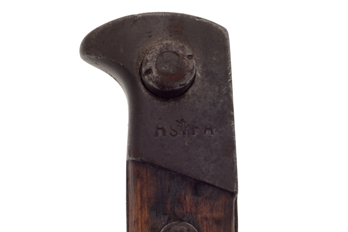 Here is an Austrian M1871/84 Turkish export bayonet for use with the M1893 and M1903 Mauser rifles. It features a 9.75-inch blade with lightly sharpened edge and is marked "OE WG" on the ricasso. It is marked "AS.FA" on the pommel which indicates it was shipped to Turkey and fits the M1935 bayonet pattern. Overall condition is good with some tarnishing and patina, the wood grips are worn with dings and pressure marks. Buy online today!