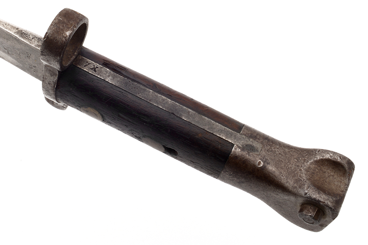 This is British Pattern 1888 Mk1 Type2 bayonet for the Lee-Metford or Lee-Enfield rifle. It features an 11.75-inch sharpened blade and overall length of 16.5 inches. It was manufactured by Wilkinson in November, 1899. Overall this bayonet is in fair condition. It has been very roughly sharpened along both edges and there are scuffs marks on both sides of the blade. The wood grips have some chips and dings and the metal has a fair amount of patina. There is no scabbard included. Buy online today!