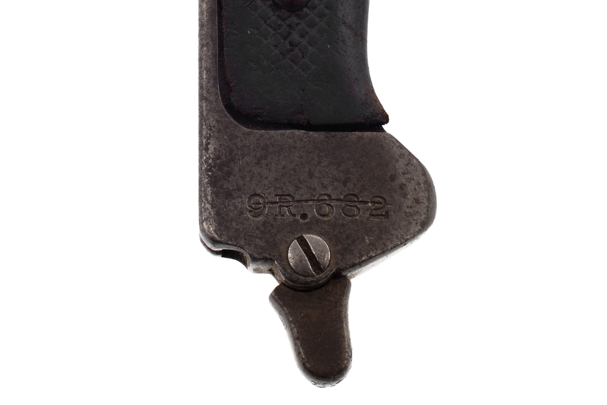 This is a Danish M1889 bayonet fop the Krag Jorgensen rifle. It features an 8.75" blade with an overall length of 15.5" and is marked "ALEX COPPEL SOLINGEN" on the ricasso and "91" on the guard indicating it was manufactured in 1891. The pommel is unit marked "9R.682" on one side and serial numbered "22270" on the other. Overall condition is fair with the original edge, the leather handle is worn with a crack on the right panel. The metal has some tarnishing and light patina. The leather scabbard has some cracks, scuffs and scratches, the seam down the middle has come apart. Buy online today!