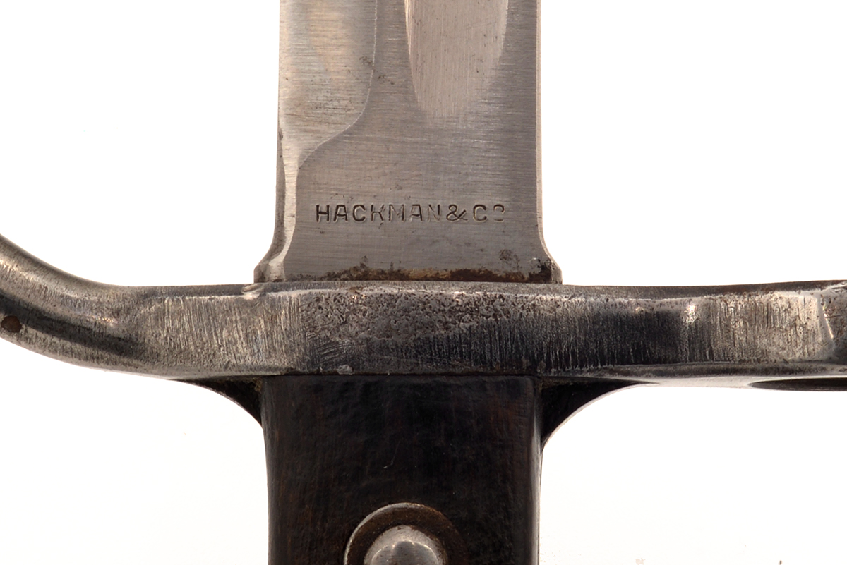 This is very rare Finnish WW2 Model 1927 bayonet for the M27 Mosin Nagant. It features an 11.75" blade with overall length of 14.25", the ricasso is marked "HACKMAN & Co" and the upper tang is serial numbered. Overall condition is good, there is some tarnishing to the metal, the tang, guard and pommel were originally blued but only faint traces now remain. Buy online today!
