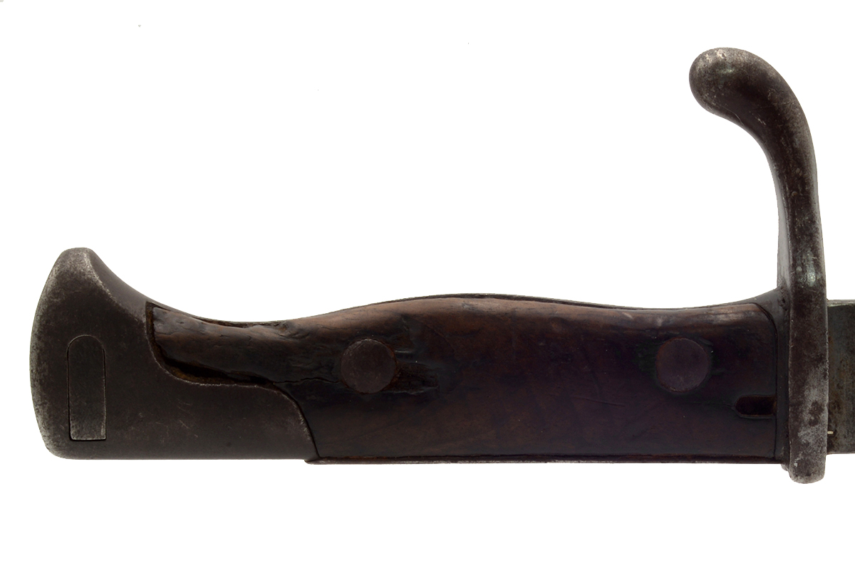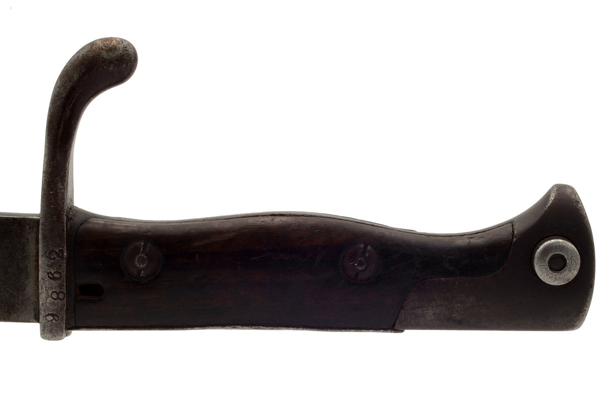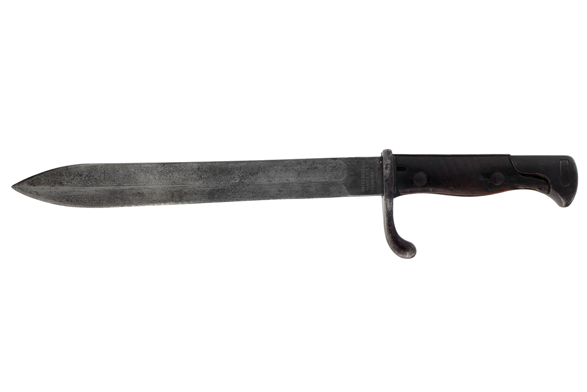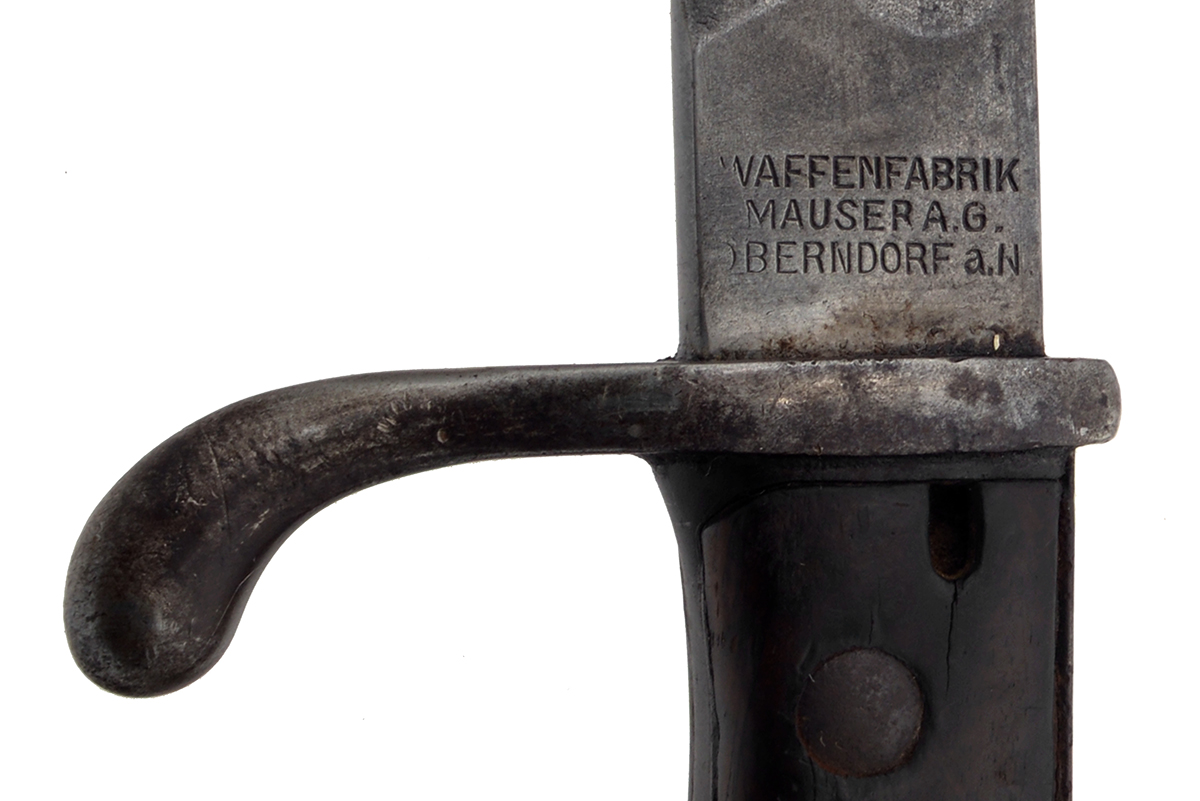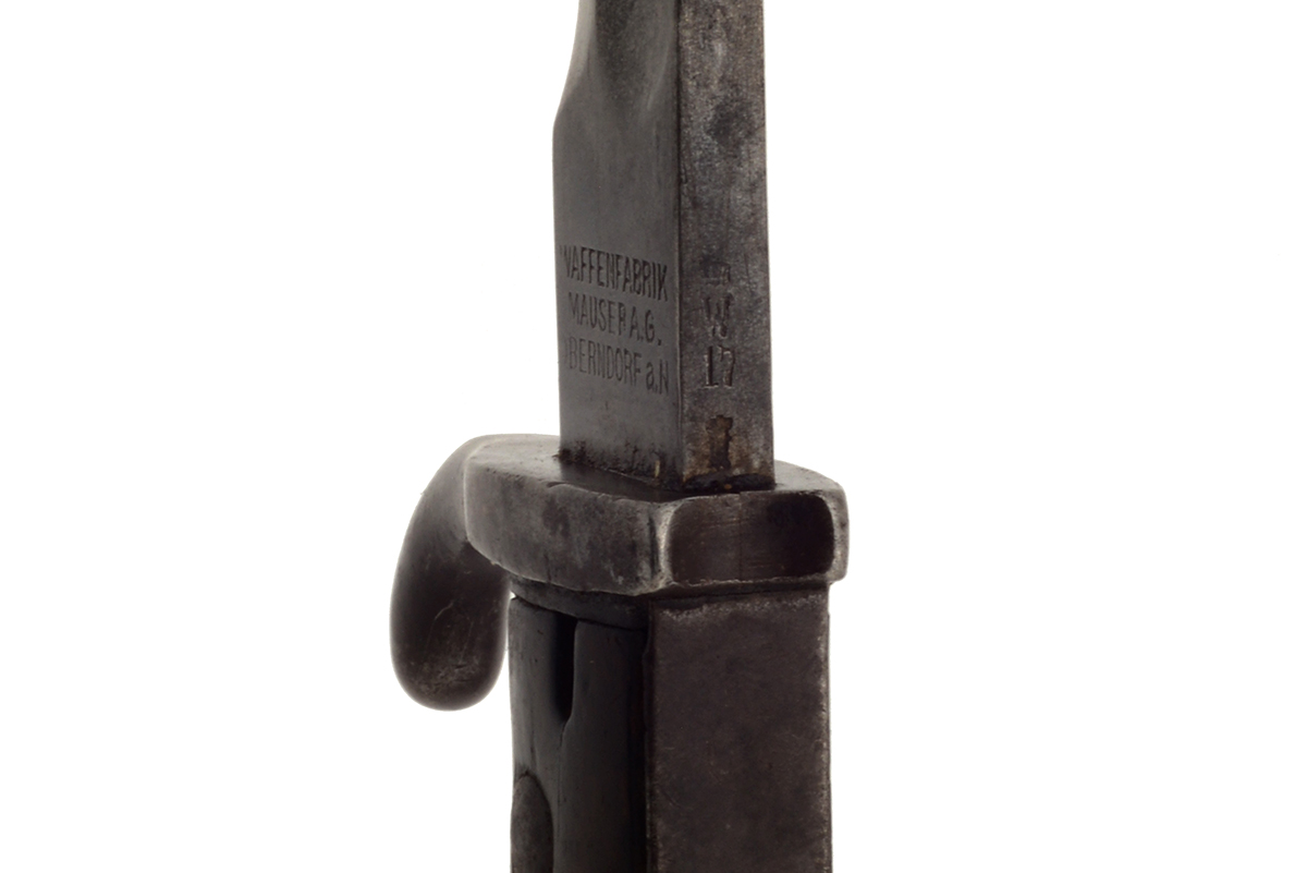 This is a German M1898/05 (G98/05) modified Sword or "Butcher" bayonet. It features a 10" cut down blade with unsharpened edge and the ricasso is marked "WAFFENFABRIK MAUSER A.G. OBERNDORF a/M" with "W 17" on the spine indicating 1917 manufacture. Overall condition of this bayonet is fair with well worn wood grips and patina to the metal. The original blade would have been 14.5" but many of these were arsenal shortened, in particular those supplied to Turks during WW1 as they preferred the shorter blade length. There is no scabbard included with this bayonet. Buy online today!