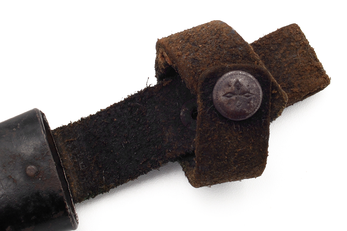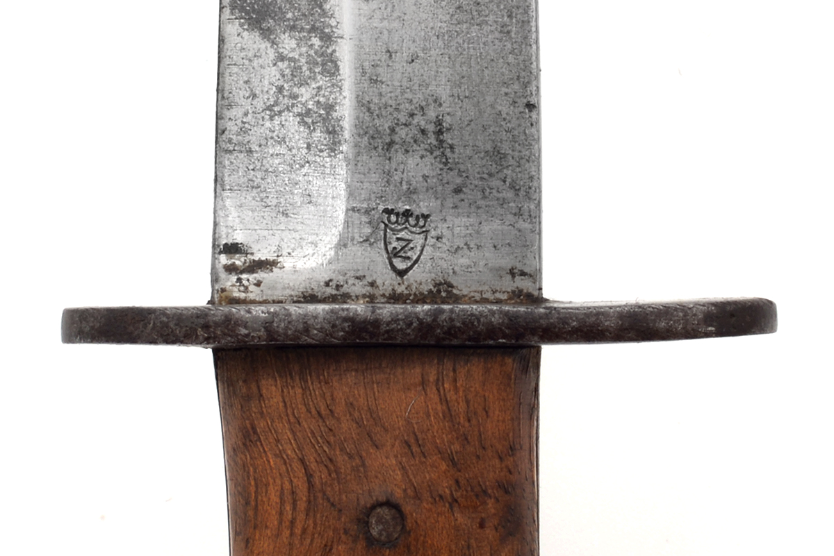 WW1 German Trench Knife made by Clemen & Jung. It features a 6.75" blade and 10.5" overall, it is marked with the shield with "Z" logo on one side of the ricasso indicating Clemen & Jung manufacture and the Imperial ordnance acceptance stamp on the opposite side. Overall condition is fair, the edge is possibly original but the blade appears to have been cleaned up a bit. The blade is slightly bent about 1/2" from the tip, there is some tarnishing to the blade and crossguard along with rusting to the tang. The wood grip has some staining, pressure marks, scuffs and small nicks. The black painted metal scabbard has rust and corrosion, the leather attachment is in decent shape. Buy online today!