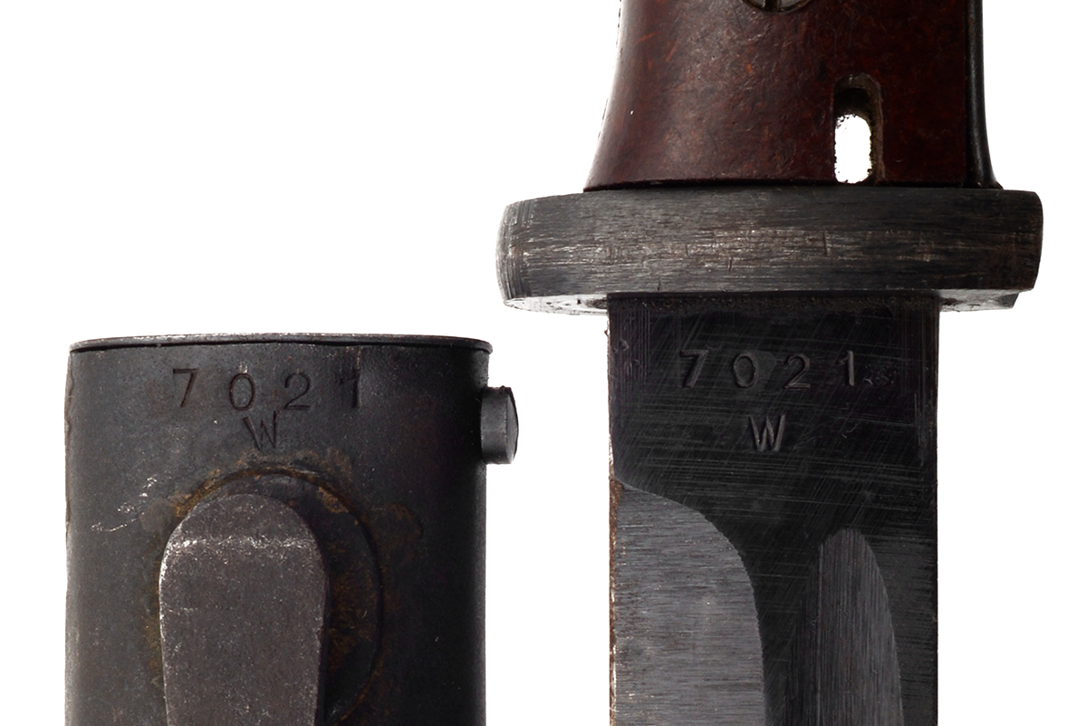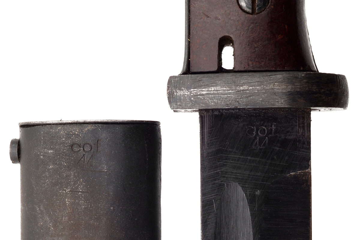 This is a German WW2 bayonet for the Mauser K98 rifle. It features a 10" blade and 15.25" in overall length, the ricasso is serial numbered "7021/W" on one side and "COF/44" on the other indicating is was made in 1944 by Carl Eickhorn, Solingen. Overall condition is fair, the blade has been sharpened but the scabbard is numbered to the bayonet. The metal has some patina, bluing wear and there are some sharpening scuffs on the right side of the blade. The scabbard has some were and patina as well. Buy online today!