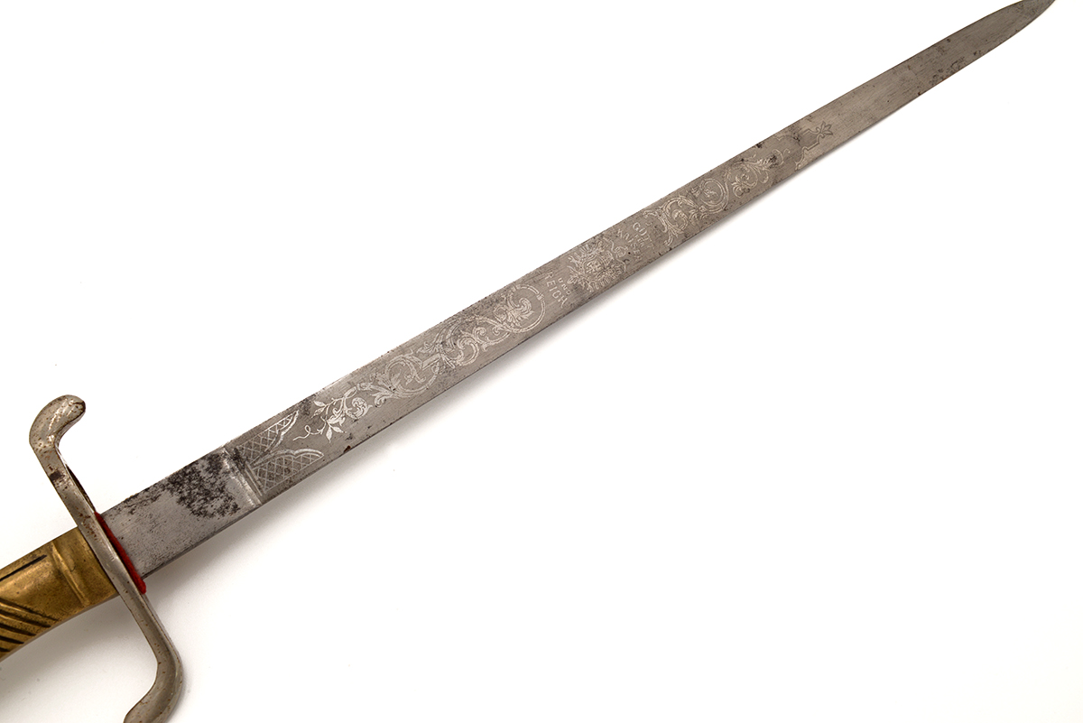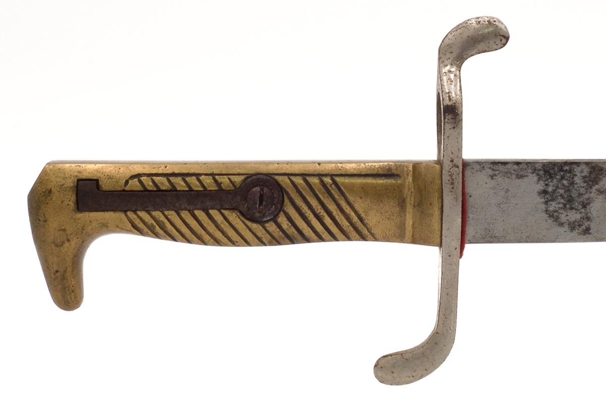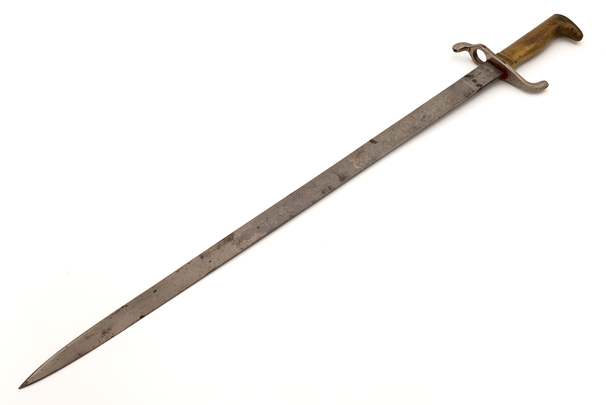 This is an original Imperial German WWI M1871 "Walking Out" etched parade dress bayonet. It features an 19.25" etched blade with brass handle and overall length of 23.5", it marked on the blade "MIT GOTT FÜR KAISER UND REICH" which translates to "With God for Emperor and Country". The hilt does have the inlet leaf spring on the right side but there is no lug slot on top, these "Walking Out" bayonets were manufactured only for show and never intended to be attached to the Mauser 1871 rifle. Overall condition is good with the original unsharpened edge, there is some tarnishing to the blade and handle along with some patina. Buy online today!