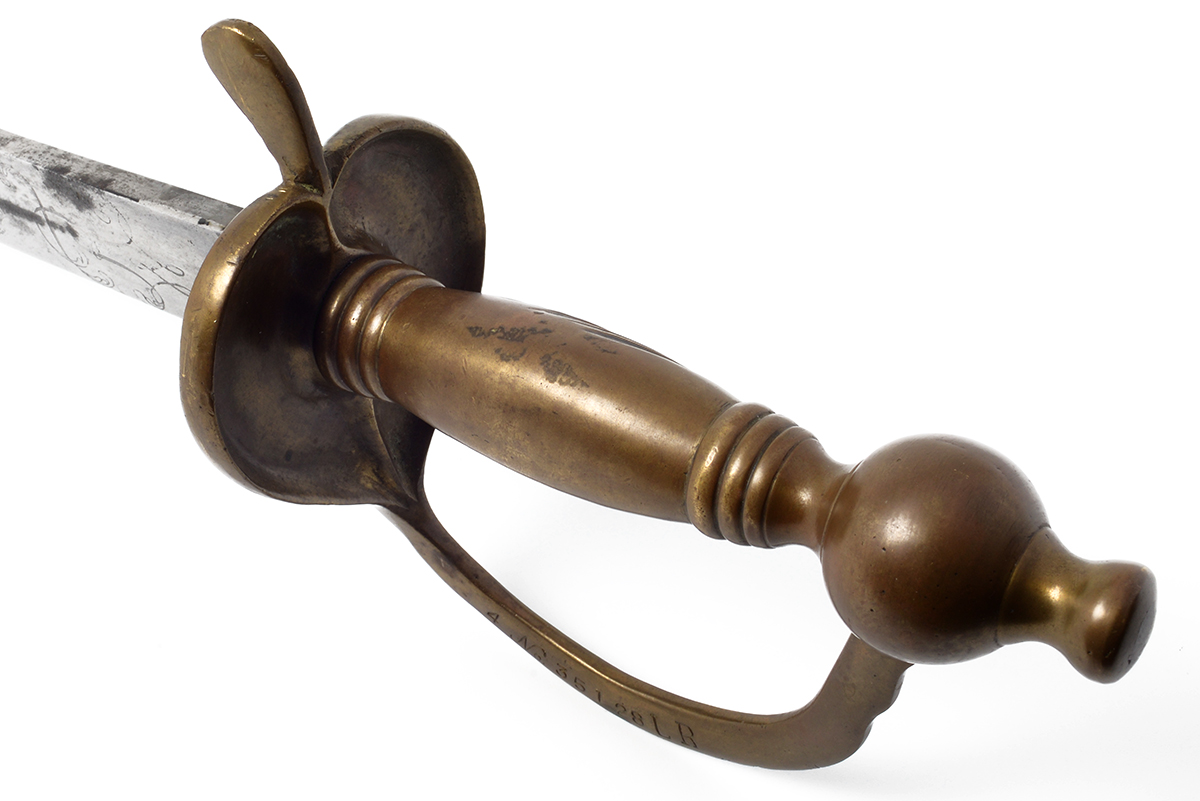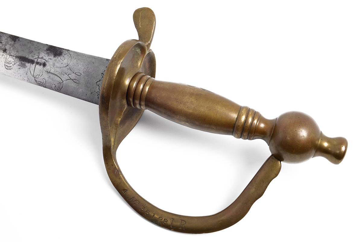 This is a Napoleonic era Prussian M1715/1786M infantry hanger saber. It features a 25.5" blade, total length of 31.5", solid brass handle and guard and features the "FWR" royal cypher of Frederick William III. The top of the guard is marked ""1 Y. 1.6" which is the order number found on all examples of this sword, the knucklebow is marked "4 No. 351 28 L R" which most likely indicates that this was weapon number 351 issued to the the 28th Landwehr Regiment. It is not out of the realm of possibility that this sword saw use at Waterloo. At Waterloo, the 28th (North Gloucestershire) Regiment of Foot was a key British infantry unit in Kemp's Brigade, fighting fiercely at Quatre Bras and on the main battlefield, forming squares under cavalry attack and charging with cavalry, proving their discipline and earning praise, despite significant confusion and losses in the chaotic final stages of the battle. They famously rallied with the cry "28th remember Egypt" during a desperate defense against French cavalry near Gémioncourt. We will probably never know if this sword was carried at Waterloo but it is certainly a fascinating piece of military history. Overall condition is good with the original edge, there is some tarnishing to the blade and spots of corrosion however considering it is over 200 years old is it is in very nice shape! There is no scabbard included with this sword. Buy online today!