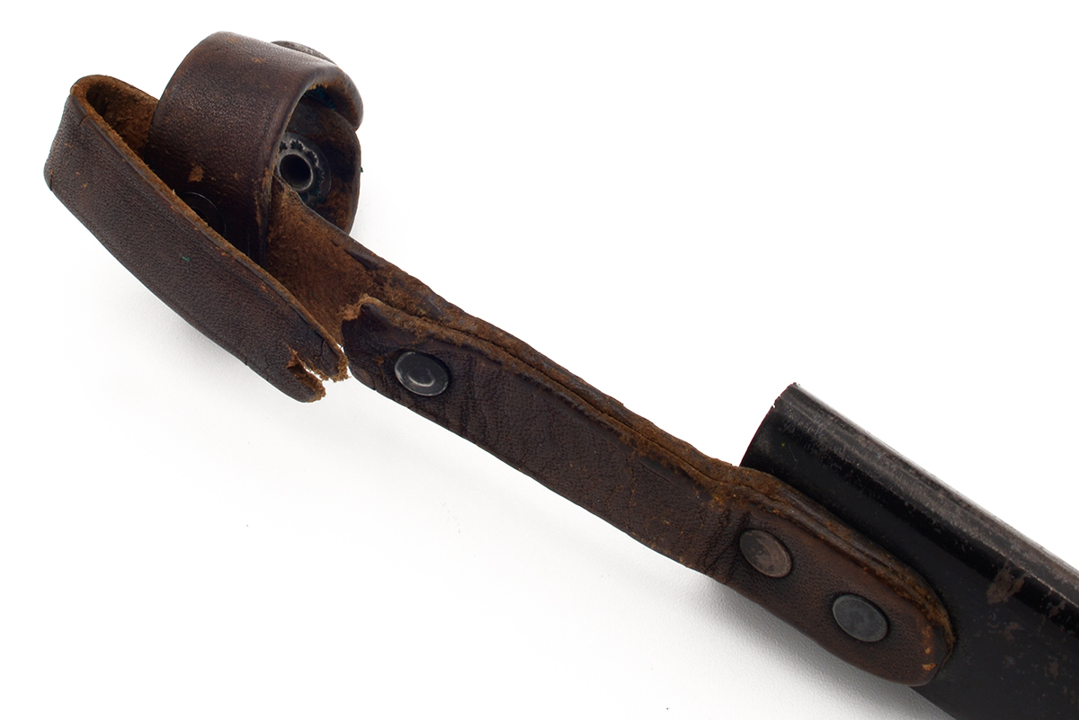 This is an original WW2 German Youth Knife. It features a 5.5" blade and total length of 9.75", it is marked on the ricasso "RZM M7/13" indicating that it was manufactured by Arthur Schuttelhofer Company. Overall condition of this knife is unfortunately poor, the guard has been broken off and the blade edge is badly sharpened. The grip panels are a bit loose and the there is quite a bit of wear to the finish, the blade has scratches and scuff marks. The scabbard has quite a bit of wear to the finish and the leather belt loop is broken. Buy online today!