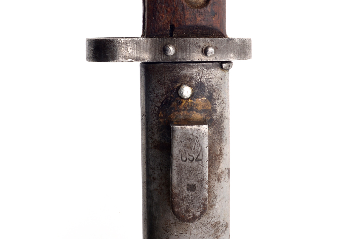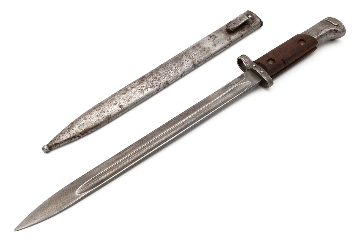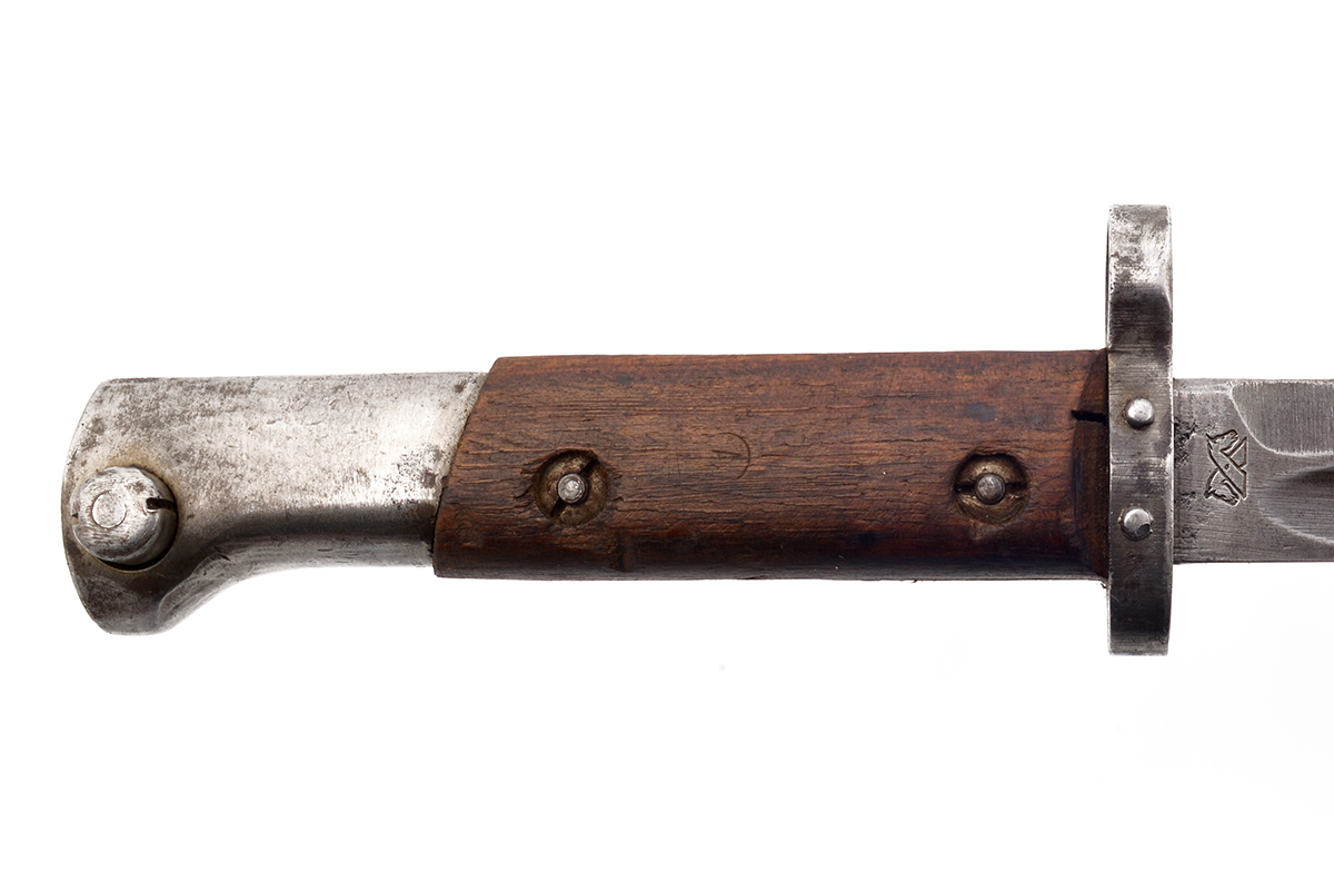 This is a Romanian VZ-24 bayonet for the Mauser rifle. It features an 11.75" blade and total length of 17", the ricasso is marked with the double horse head logo of the Austrian company Redtenbacher who had a joint venture in Sibiu, Romania. Overall condition of the bayonet is good with the original edge, there is some tarnishing and patina to the metal along with some chips and nicks to the wood grip panels. The scabbard has a fair amount of wear to the finish along with some patina and dents. Buy online today!