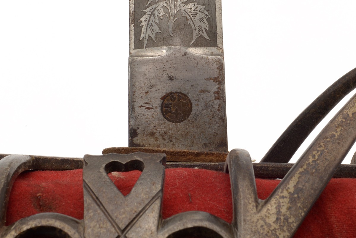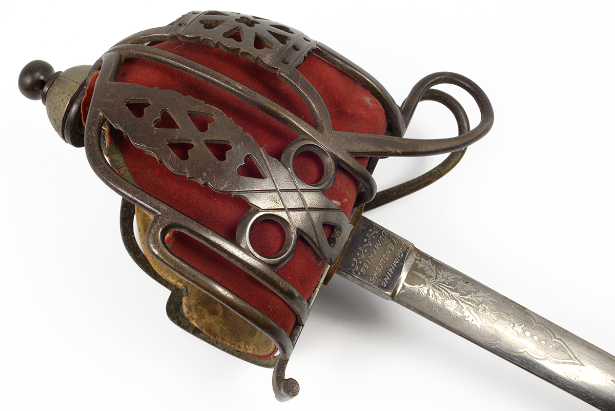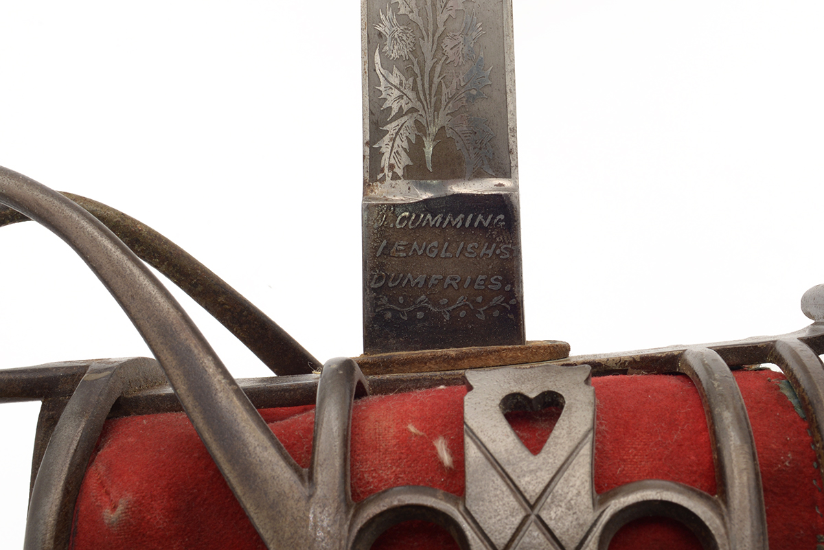 This is a Scottish 1828 Pattern Highland Officers Basket Hilt Sword. It features a 31.5" engraved double fuller steel blade, total length of 38", steel basket hilt guard with leather and felt lining and wire wrapped ray skin handle. The ricasso is marked "J.CUMMING 1 ENGLISH ST DUMFIRES" on one side and proof marked on the other. The blade features the H.M. Queen Victoria Royal Cypher (crown over VR) who reigned between 1837 and 1901, we could find no information about the retailer named on the ricasso. Overall condition is good with the original edge, the blade some tarnishing and light scratches but the engraving is well defined, the guard has patina and lining could use a good cleaning.Included is the original scabbard that has been painted silver at some point, it has scuffs, scratches and a few dents. Buy online today!