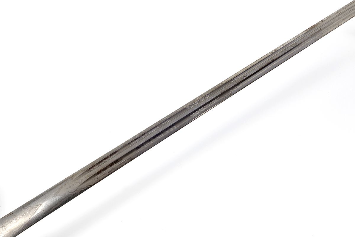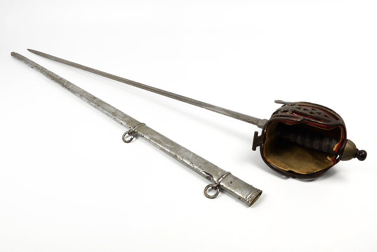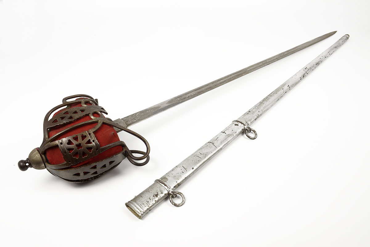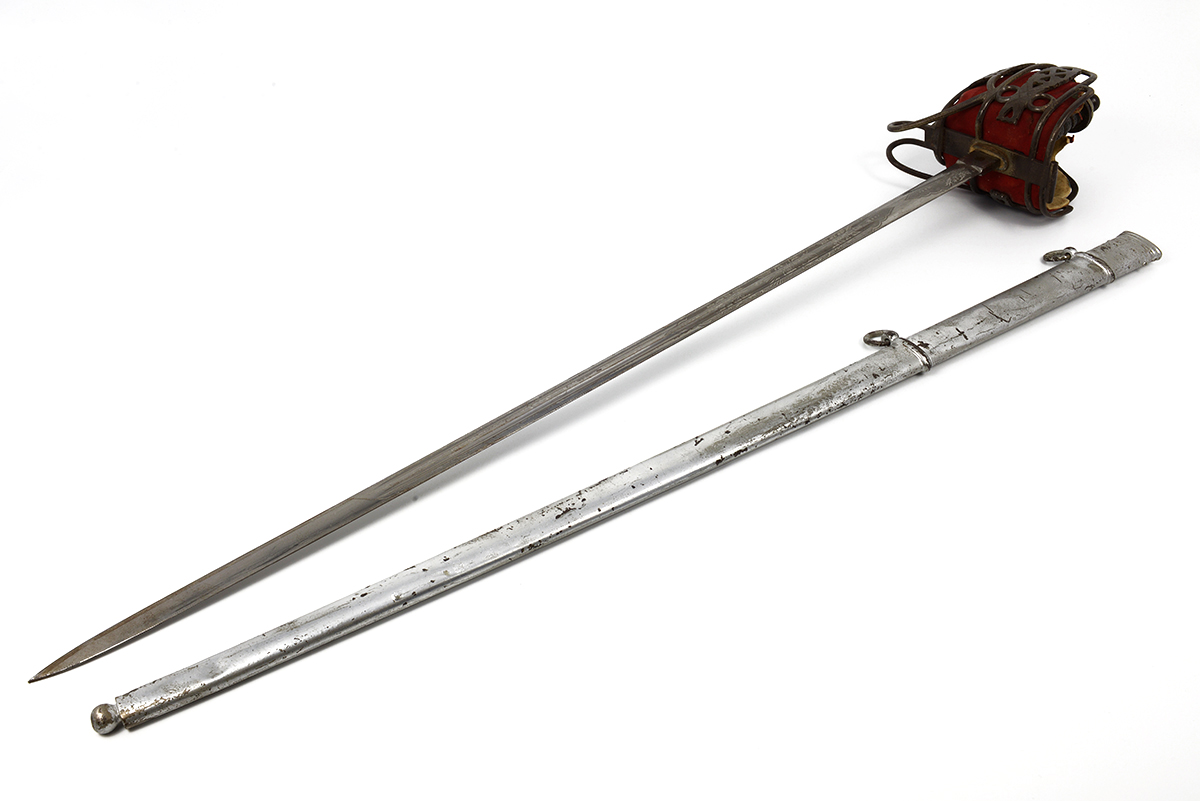 This is a Scottish 1828 Pattern Highland Officers Basket Hilt Sword. It features a 31.5" engraved double fuller steel blade, total length of 38", steel basket hilt guard with leather and felt lining and wire wrapped ray skin handle. The ricasso is marked "J.CUMMING 1 ENGLISH ST DUMFIRES" on one side and proof marked on the other. The blade features the H.M. Queen Victoria Royal Cypher (crown over VR) who reigned between 1837 and 1901, we could find no information about the retailer named on the ricasso. Overall condition is good with the original edge, the blade some tarnishing and light scratches but the engraving is well defined, the guard has patina and lining could use a good cleaning.Included is the original scabbard that has been painted silver at some point, it has scuffs, scratches and a few dents. Buy online today!
