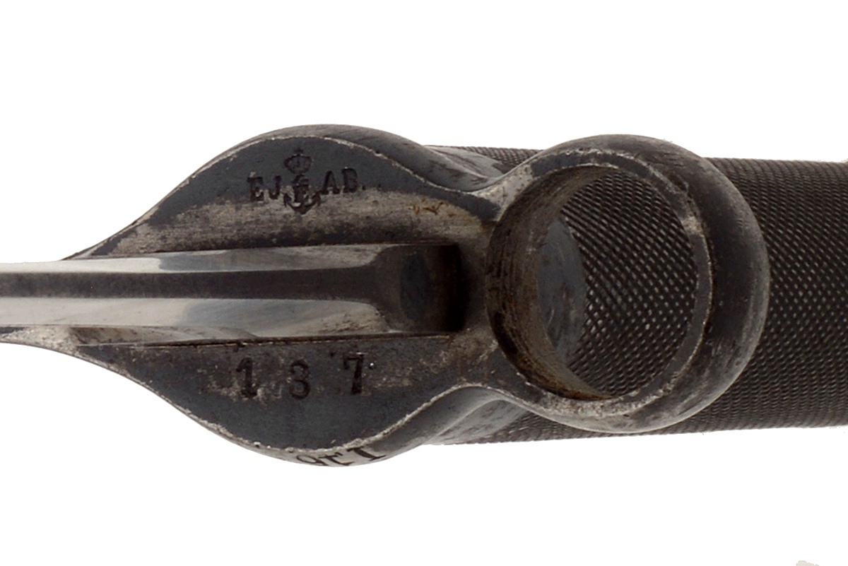 This is a Swedish M1896 bayonet for the M96, M38 or AG42B Ljungmann Rifle. It features an 8.25" blade with metal handle and manufactured by Eskilstuna Jernmanufactur AB. The overall condition of this bayonet is good, however the edge has been sharpened. The guard, hilt and pommel have some wear to the bluing and light patina. There is no scabbard included with this bayonet. Buy online today!