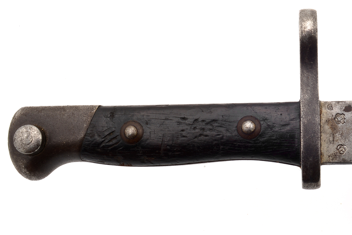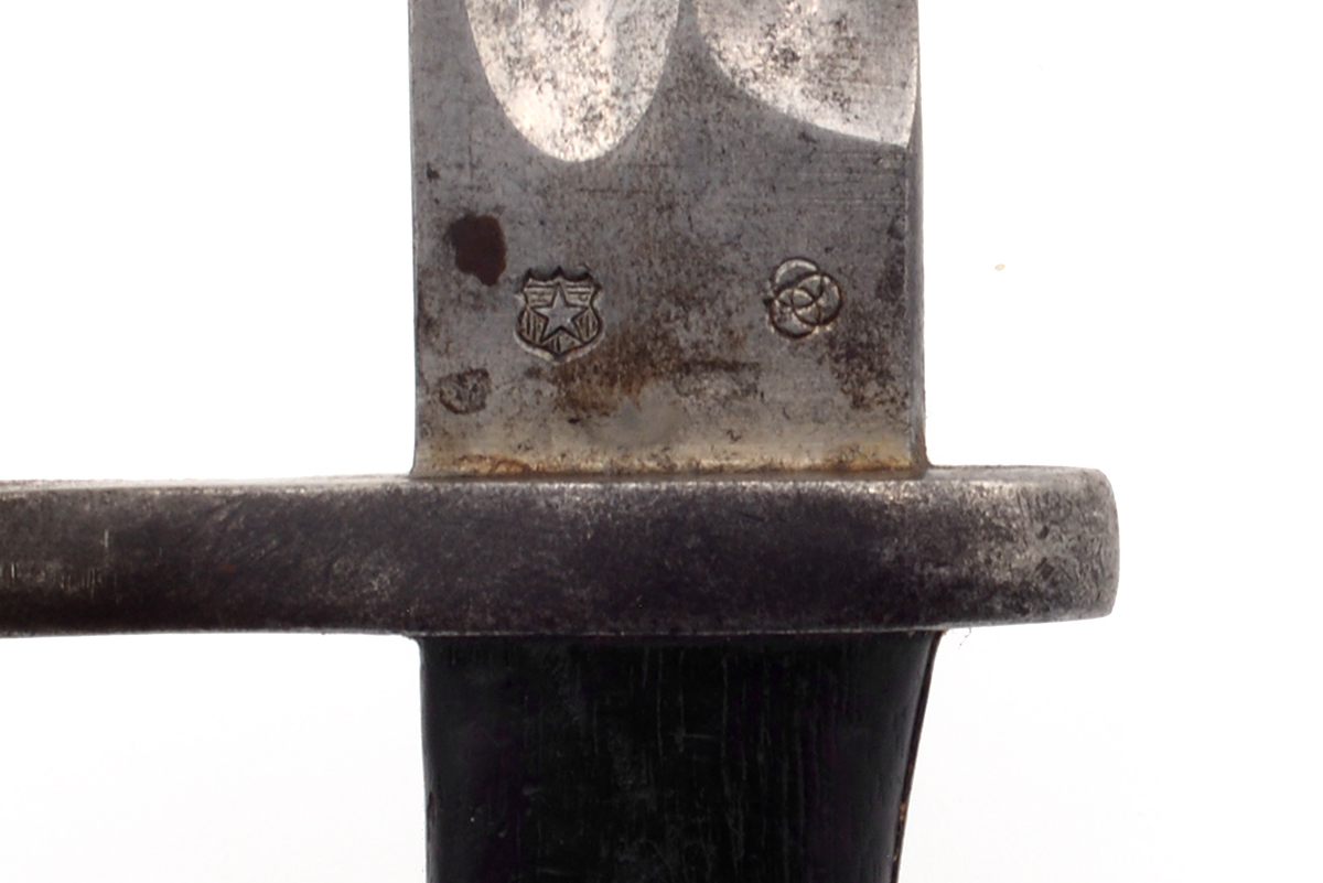 This is a Weyersberg Kirschbaum Solingen M1895 bayonet for the Chilean Mauser rifle. It features a 10" blade with the original unsharpened edge and wood grips. The ricasso is marked with the he three intertwined circles proof which is the trademark of the famous steelworks, Krupp who supplied the blade and was at the turn of the 19th Century (when these bayonets were made) the largest company in Europe. Overall condition of this bayonet is good with some tarnishing light patina. The wood grips have some wear, chips and pressure marks, there is an "R" etched into the left side panel. There is no scabbard included with this bayonet. Buy online today!