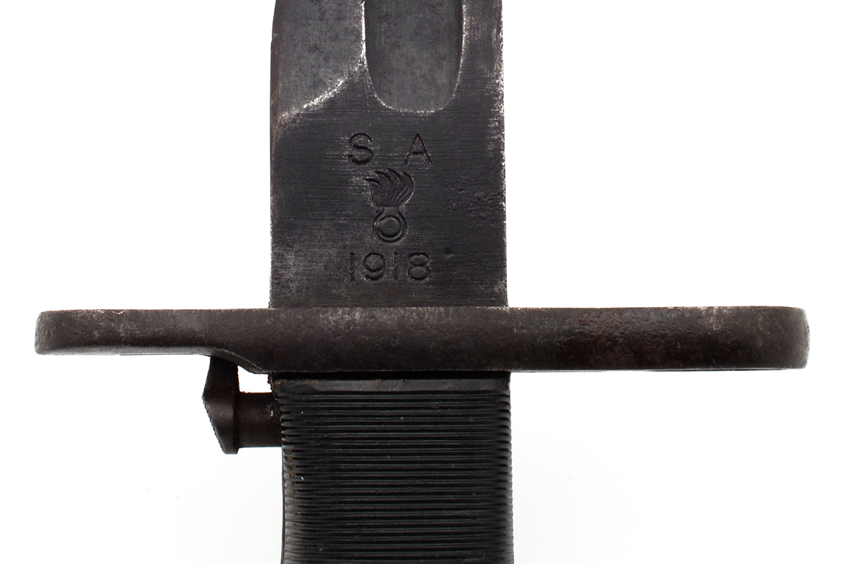 This is a Springfield Armory WW2 M1905 M1 bayonet with rare shortened leather scabbard. It features a 10" blade and overall length of 14.5", one side of the ricasso is marked "S A" over flaming bomb "1918" and on the other side is marked "US" over "974387" proof mark to the right of it. The bayonet comes with a rarely seen shortened leather scabbard, this was not a common practice and probably makes this a very early conversion. Overall condition of the bayonet is good, there is some wear and patina to the metal, the leather scabbard has some wear, scuffs and scratches but the stitching is good. Buy online today!